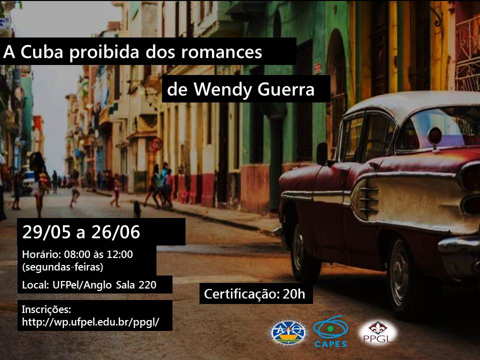 O PPG Letras promove o Curso “A Cuba proibida dos romances de Wendy Guerra”, ministrado pelo mestrando Otávio Botelho Rosa. O curso, com certificação de 40h, tem como público-alvo graduandos dos cursos de Letras, e por objetivo a discussão de romances da escritora cubana Wendy Guerra, nascida em 1970, particularmente Nunca fui primeira dama e Todos se vão.
