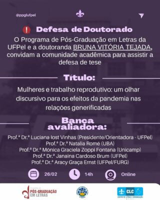 O Programa de Pós-Graduação (PPGL), juntamente com a aluna Bruna Vitória Tejada, convidam a comunidade acadêmica para assistir a defesa de sua tese. A apresentação acontece no dia 26 de Fevereiro (quarta-feira), e é possível acompanhar via Webconferência, no link: https://webconf.ufpel.edu.br/b/luc-ygm-fha. O título da sua tese é: “Mulheres e trabalho reprodutivo: um olhar discursivo para os efeitos da pandemia nas relações generificadas”, e tem como banca avaliadora a Profa. Dra. Luciana Iost Vinhas (Presidente – Orientadora UFPel), a Profa. Dra. Natália Romé (UBA), […]