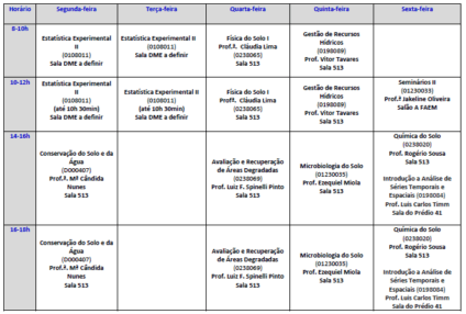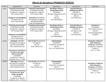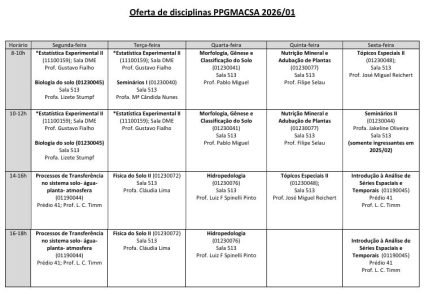 A estrutura curricular do PPGMACSA é formada por disciplinas com conteúdos básicos e disciplinas com conteúdos aplicados nas áreas de solos, hidrologia e de geotecnologias. As disciplinas são ofertadas em regime semestral de forma que os alunos possam cursar primeiramente as de conteúdo mais básico e após aquelas de conteúdo aplicado. Os alunos são orientados na escolha das disciplinas visando uma formação qualificada em conteúdos que serão importantes para seu tema de pesquisa. O Plano de estudos e o projeto de pesquisa dos discentes são apresentados e defendidos em seminário do PPGMACSA e passam por avaliação e aprovação de todo o corpo docente e discente do programa.
