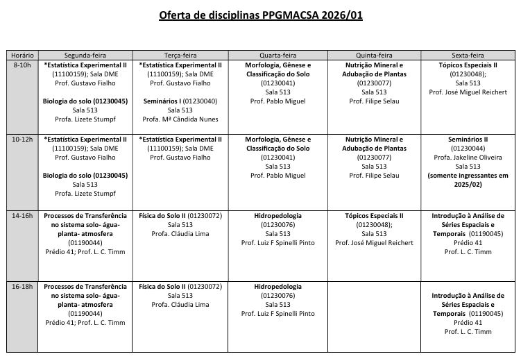 -> Alunos regulares: As matrículas só serão confirmadas e efetivadas após o preenchimento do formulário com o Termo de Responsabilidade (https://wp.ufpel.edu.br/ppgmacsa/files/2025/12/Termo-de-responsabilidade-alunos-PPGMACSA.pdf). Solicitação de matrícula via acesso ao cobalto “Aluno>>Cadastro>>Solicitação de matrícula pós”;