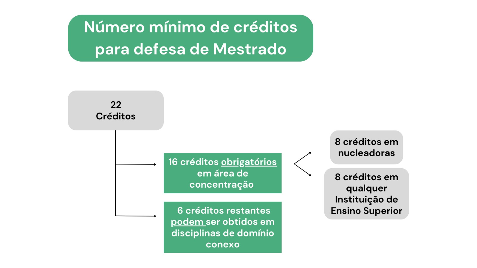 Nenhum candidato será admitido à defesa de dissertação ou tese, antes de obter, no mínimo, o total de 22 (vinte e dois) créditos para o mestrado ou 40 (quarenta) para o doutorado.