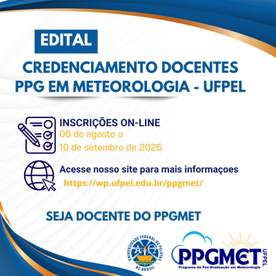 Notícias Edital Credenciamento Docente PPGMet Publicado por ppgmet on 06/08/202502/10/2025 Inscrições de 06 de agosto a 10 de setembro de 2025. Qualquer dúvida escreva para: ppgmeteorologia.ufpel@gmail.com Acesse Edital Credenciamento Docente Homologação das Inscrições Cronograma de Entrevistas Resultado Seleção