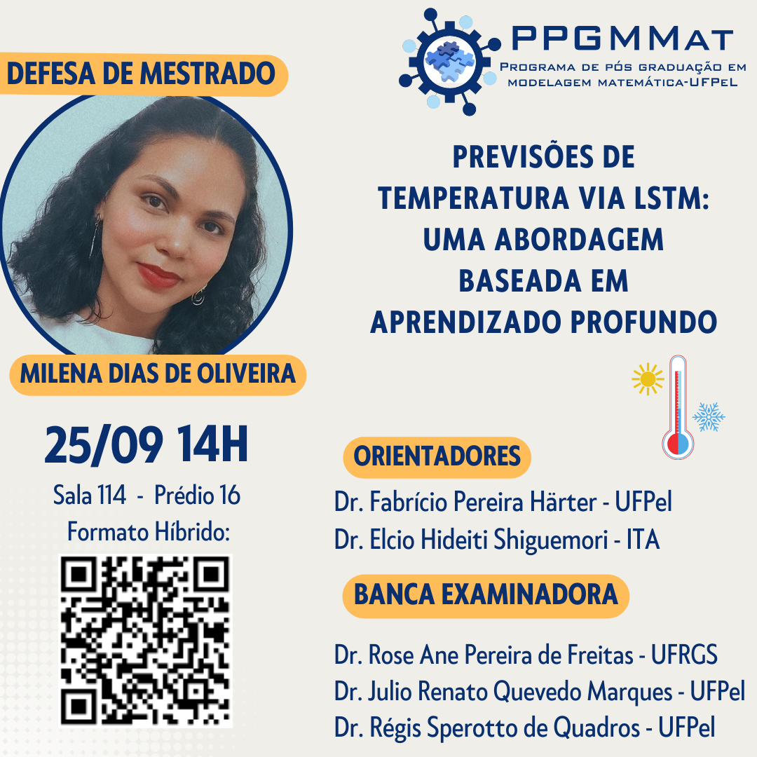 Convite para Exame de Qualificação de Mestrado de MILENA DIAS DE OLIVEIRA intitulado “Previsões de temperatura via LSTM: uma abordagem baseada em aprendizado profundo“, sob orientação de Fabrício Pereira Harter.