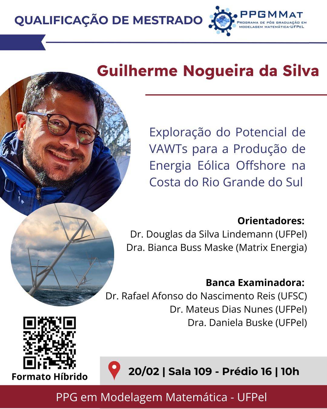 Qualificação de Mestrado de GUILHERME NOGUEIRA DA SILVA intitulado “Exploração do Potencial de VAWTs para a Produção de Energia Eólica Offshore na Costa do Rio Grande do Sul“, sob orientação de Douglas da Silva Lindemann.