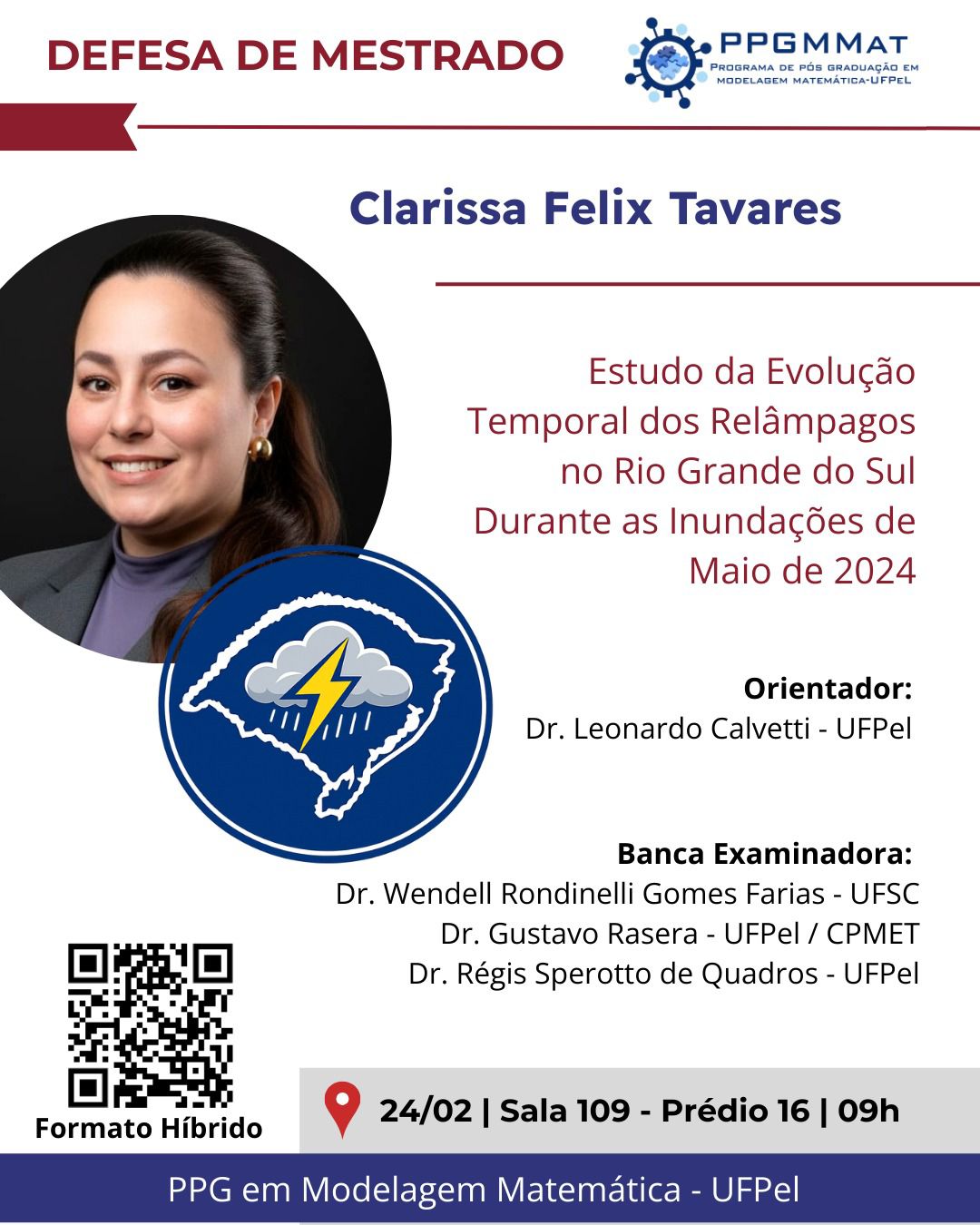 Convite para Exame de Defesa de Mestrado de CLARISSA FELIX TAVARES intitulado “Estudos da Evolução Temporal dos Relâmpagos no Rio Grande do Sul Durante as Inundações de Maio de 2024“, sob orientação de Leonardo Calvetti.