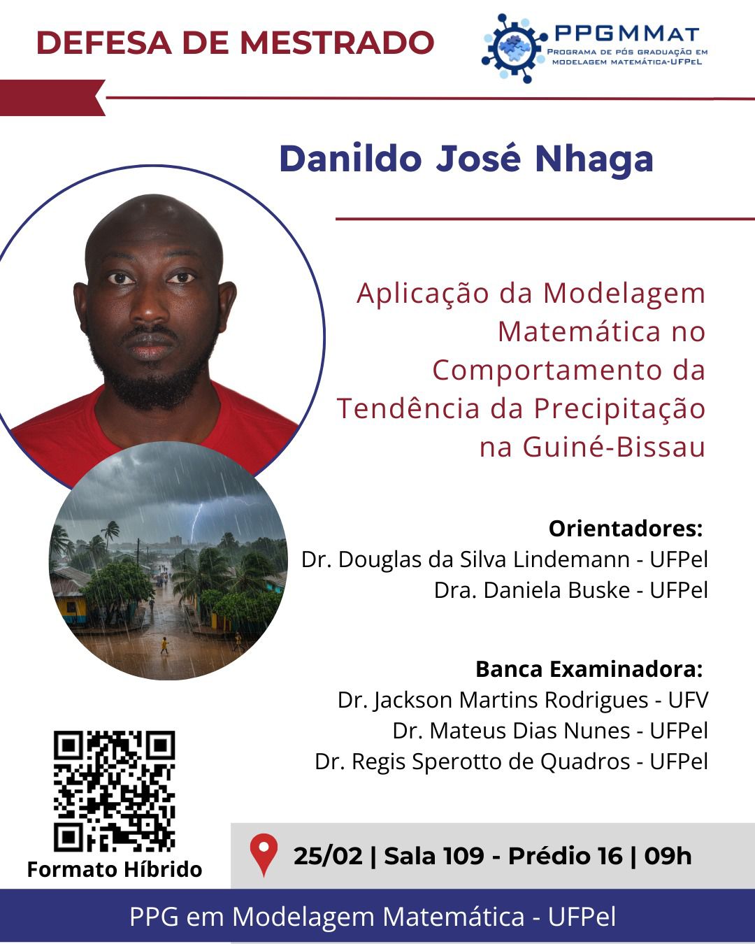 Convite para Exame de Defesa de Mestrado de DANILDO JOSÉ NHAGA intitulado “Aplicação da Modelagem Matemática no Comportamento da Tendência da Precipitação na Guiné-Bissau“, sob orientação de Douglas da Silva Lindemann.