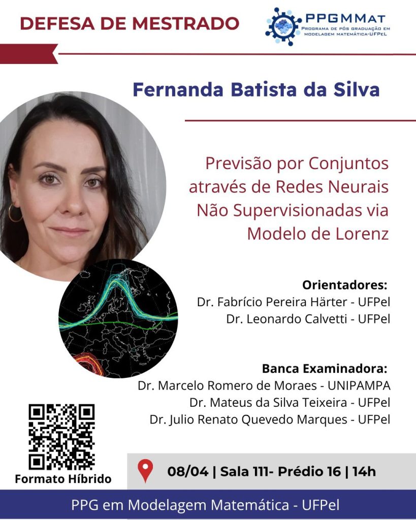 Convite para Exame de Defesa de Mestrado de FERNANDA BATISTA DA SILVA intitulado “Previsão por Conjuntos através de Redes Neurais Não Supervisionadas via Modelo de Lorenz”, sob orientação de Fabrício Pereira Härter.
