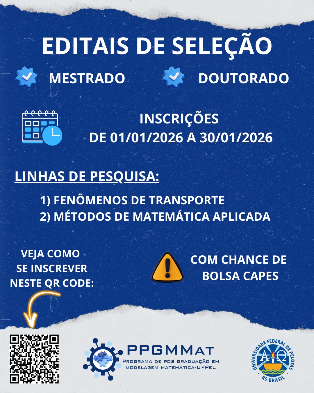 Nessa página serão disponibilizados os editais e demais documentos relacionados ao Programa de Pós-Graduação em Modelagem Matemática da UFPel (PPGMMat). Clique nos links abaixo para visualizar ou fazer download dos documentos.