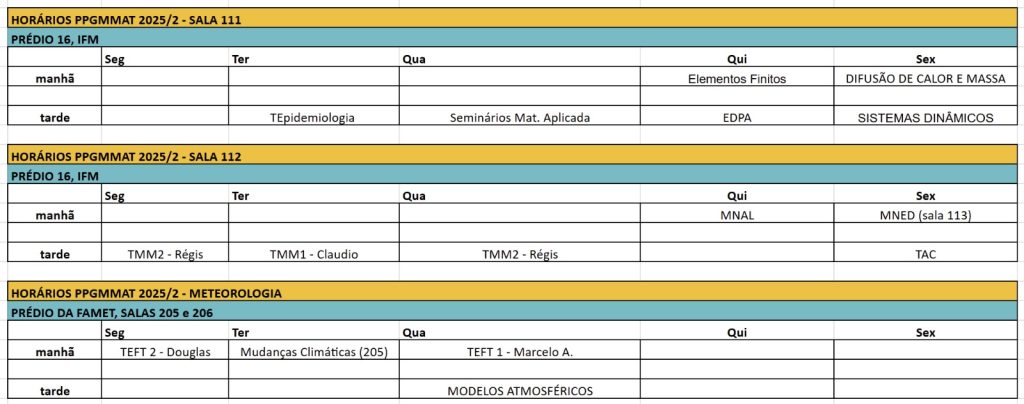 Confira abaixo os horários e locais das disciplinas do Programa de Pós-Graduação em Modelagem Matemática: Os horários e locais das aulas podem sofrer alterações. Verifique frequentemente o arquivo com a lista de horários!