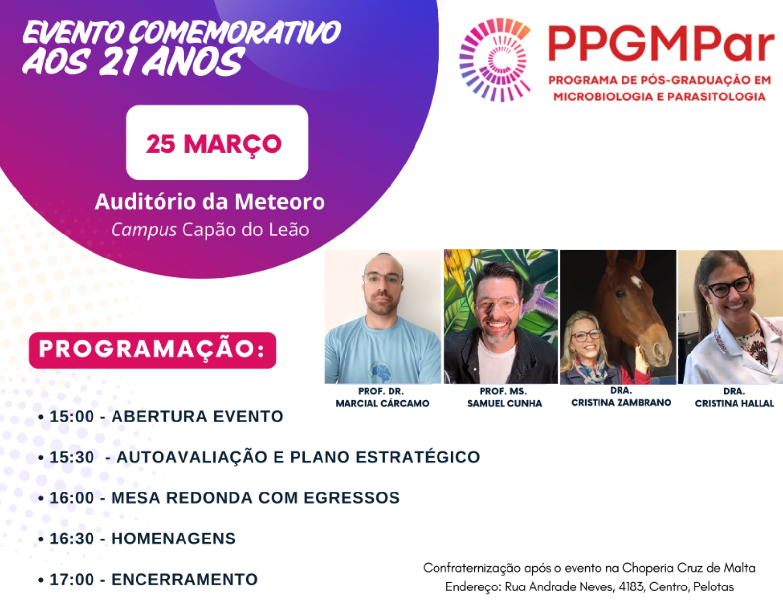 O Programa de Pós-Graduação em Microbiologia e Parasitologia (PPGMPar) tem a honra de convidar professores, chefes ex-coordenadores e demais membros da comunidade acadêmica a participarem do evento comemorativo pelos 21 anos do PPGMPar.