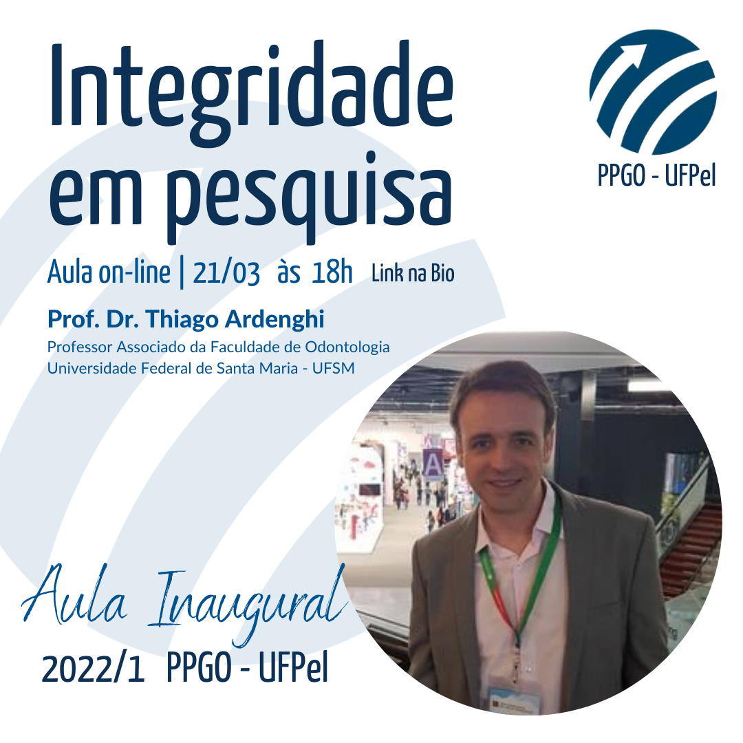 É com muita alegria que o Programa de Pós-Graduação em Odontologia da UFPel convida para a Aula inaugural de 2022/1, com o tema “Integridade em Pesquisa”.