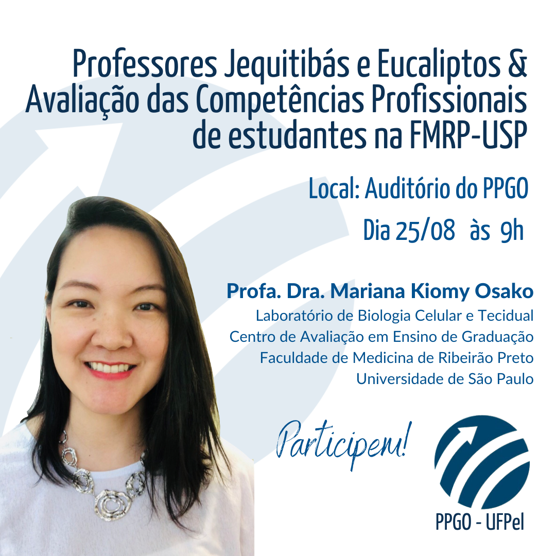 Convidamos docentes e discentes do PPGO e da Faculdade de Odontologia para a atividade presencial “Professores Jequitibás e Eucaliptos & Avaliação das Competências Profissionais de estudantes na FMRP-USP” com a Profa. Dra. Mariana Kiomy Osako, que coordena o Centro de Avaliação em Ensino de Graduação da Faculdade de Medicina de Ribeirão Preto na Universidade de São Paulo.
