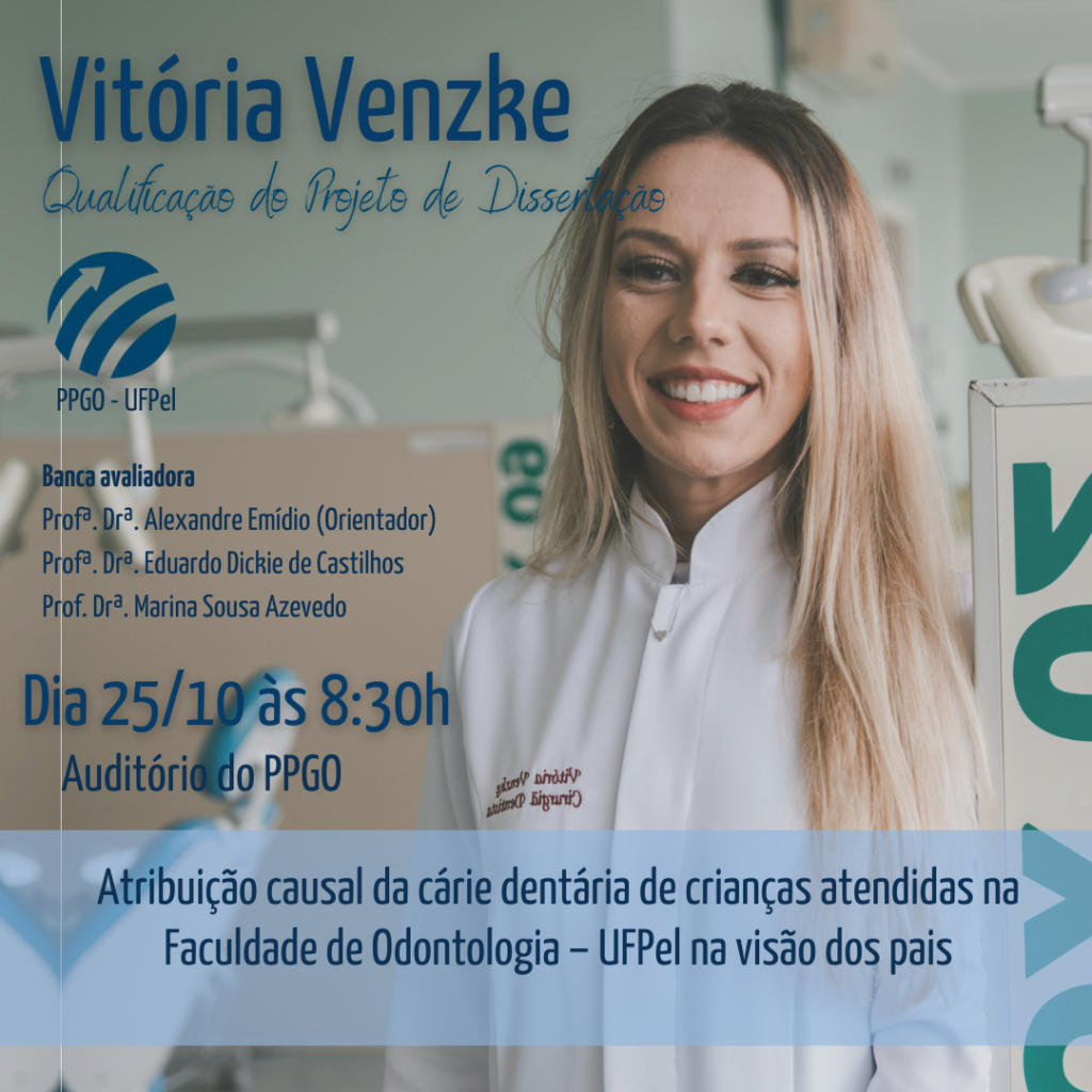 O programa de Pós-Graduação em Odontologia da UFPel convida você para a Defesa da Qualificação do Projeto de Dissertação de Mestrado da aluna Vitória Venzke Pinheiro, intitulado “Atribuição causal da cárie dentária de crianças atendidas na Faculdade de Odontologia – UFPel na visão dos pais”, a realizar-se no dia 25 de outubro as 08h30min, no Auditório do PPGO 5º andar da Faculdade de Odontologia, ficando assim constituída: