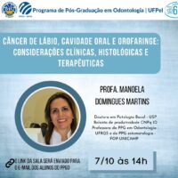 Palestra PPGO 07/10 Nesta próxima quinta-feira, 07.10, teremos a honra de ouvir a Profa. Manoela Domingues Martins, uma referência nacional e internacional dentro da Patologia Oral. A atividade terá como objetivo abordar os principais aspectos clínicos e terapêuticos do carcinoma bucal, tema de interesse a todas as áreas da Odontologia. Prestigiem esse momento imperdível!