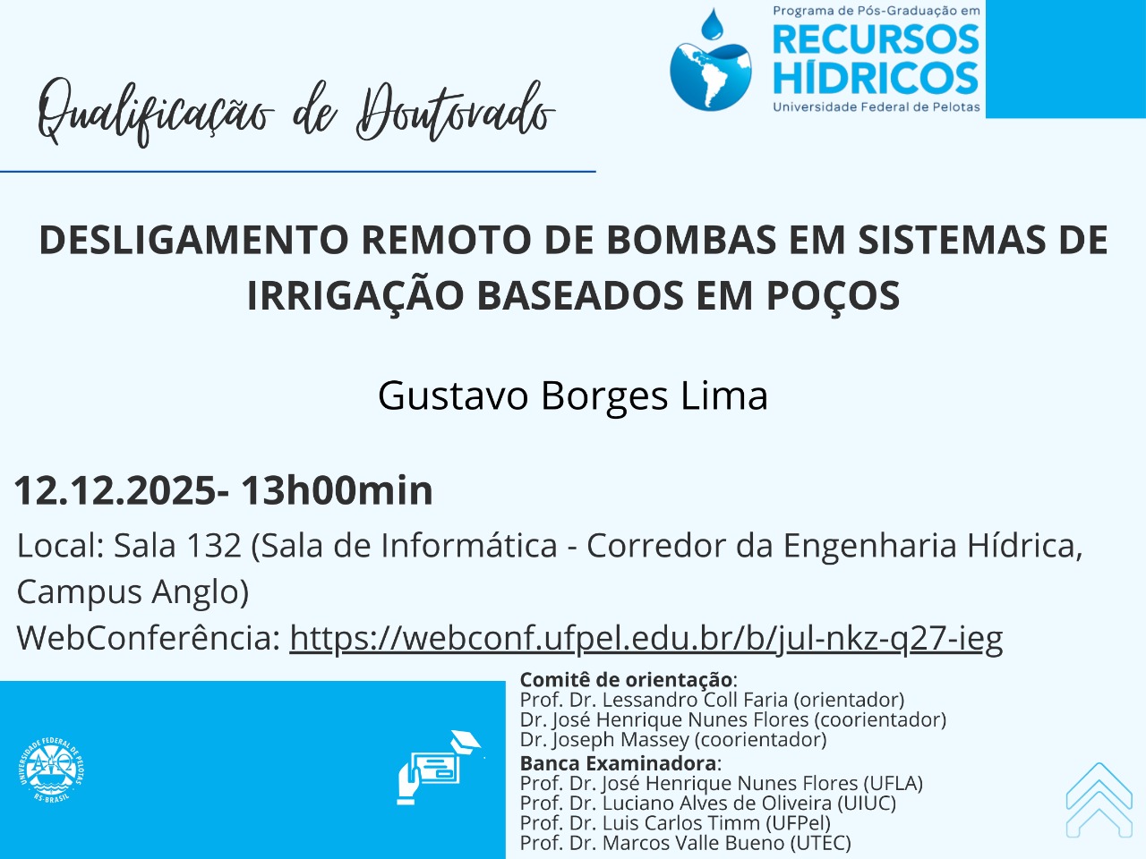 O Programa de Pós-Graduação em Recursos Hídricos da UFPel convida a comunidade acadêmica e demais interessados a prestigiarem a qualificação de doutorado do discente Henrique Sanchez Franz, intitulada: