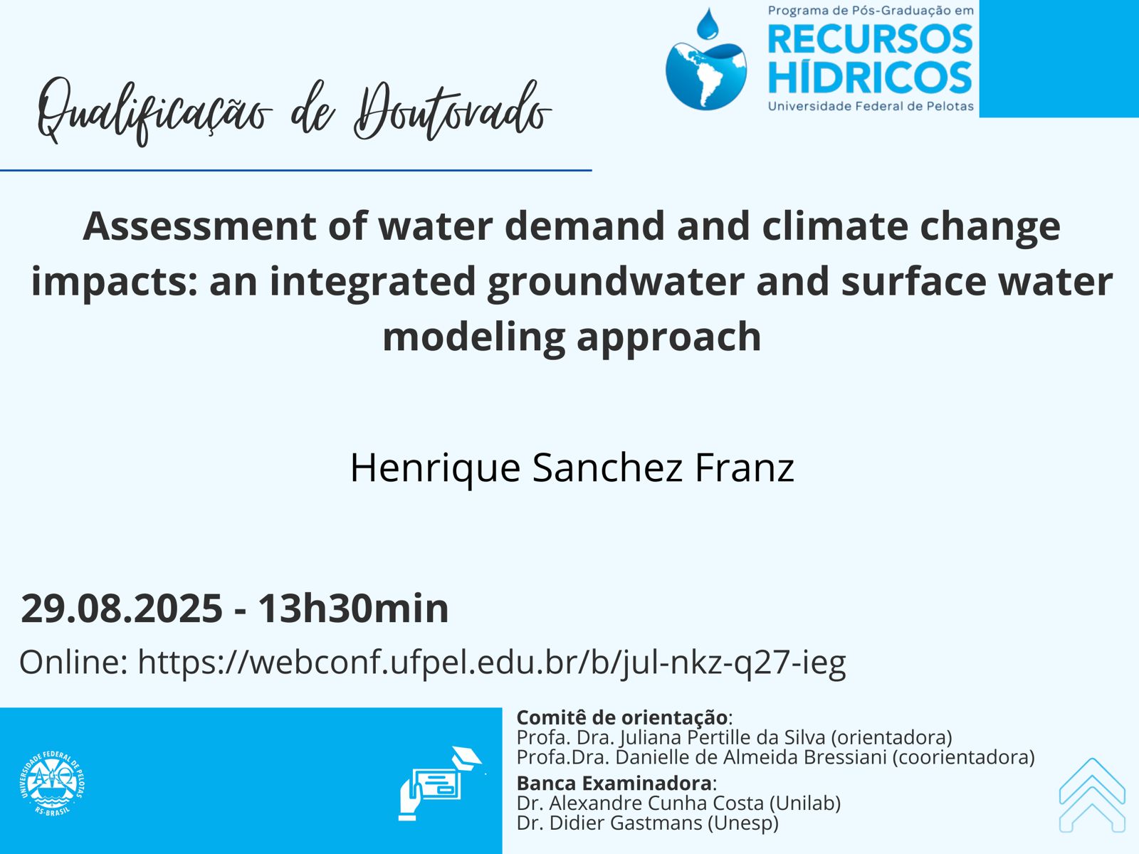 O Programa de Pós-Graduação em Recursos Hídricos da UFPel convida a comunidade acadêmica e demais interessados a prestigiarem a qualificação de doutorado do discente Henrique Sanchez Franz, intitulada: “Assessment of water demand and climate change impacts: an integrated groundwater and surface water modeling approach” 📅 Data: 29 de agosto de 2025⏰ Horário: 13h30min🌐 Local: Online – Acesse aqui Comitê de orientação: Profa. Dra. Juliana Pertille da Silva (orientadora) Profa. Dra. Danielle de Almeida Bressiani (coorientadora) Banca Examinadora: Dr. Alexandre Cunha Costa (Unilab) Dr. Didier Gastmans […]
