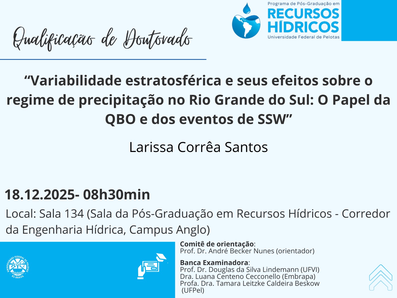 O Programa de Pós-Graduação em Recursos Hídricos (PPGRH/UFPel) convida a comunidade acadêmica para a Qualificação de Doutorado da discente Larissa Corrêa Santos, intitulada: