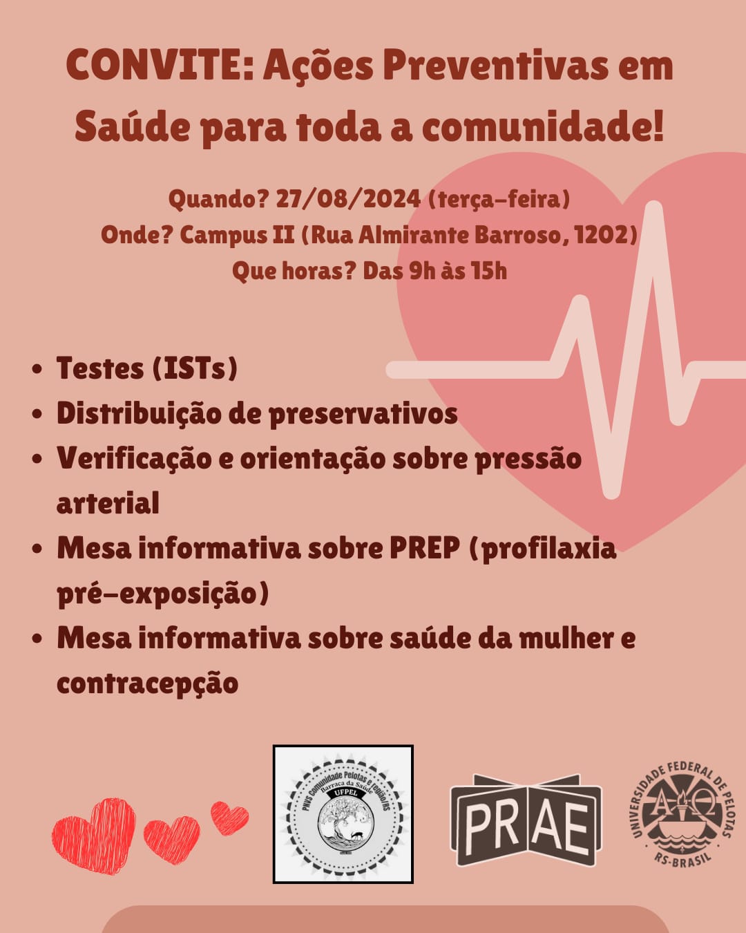 Ações de prevenção em saúde – Testes (ISTs) – Distribuição de preservativos – Informações sobre PREP (profilaxia pré-exposição) – Informações sobre saúde da mulher e contracepção – Verificação e orientação sobre pressão arterial |