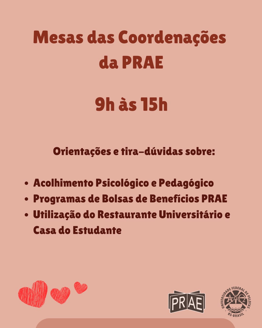 Mesas das Coordenações PRAE: Permanência/Ingresso/Políticas Estudantis Orientações sobre: – Acolhimento Psicológico e pedagógico do NUPADI – Programas de Bolsas de Benefícios PRAE – Restaurante Universitário e Casa do Estudante |