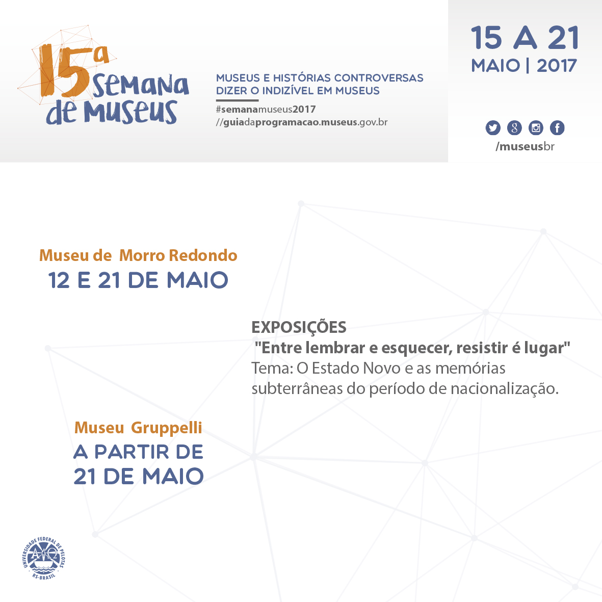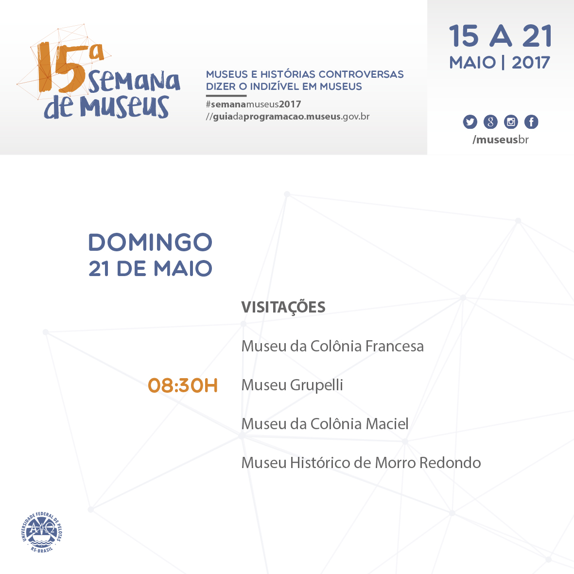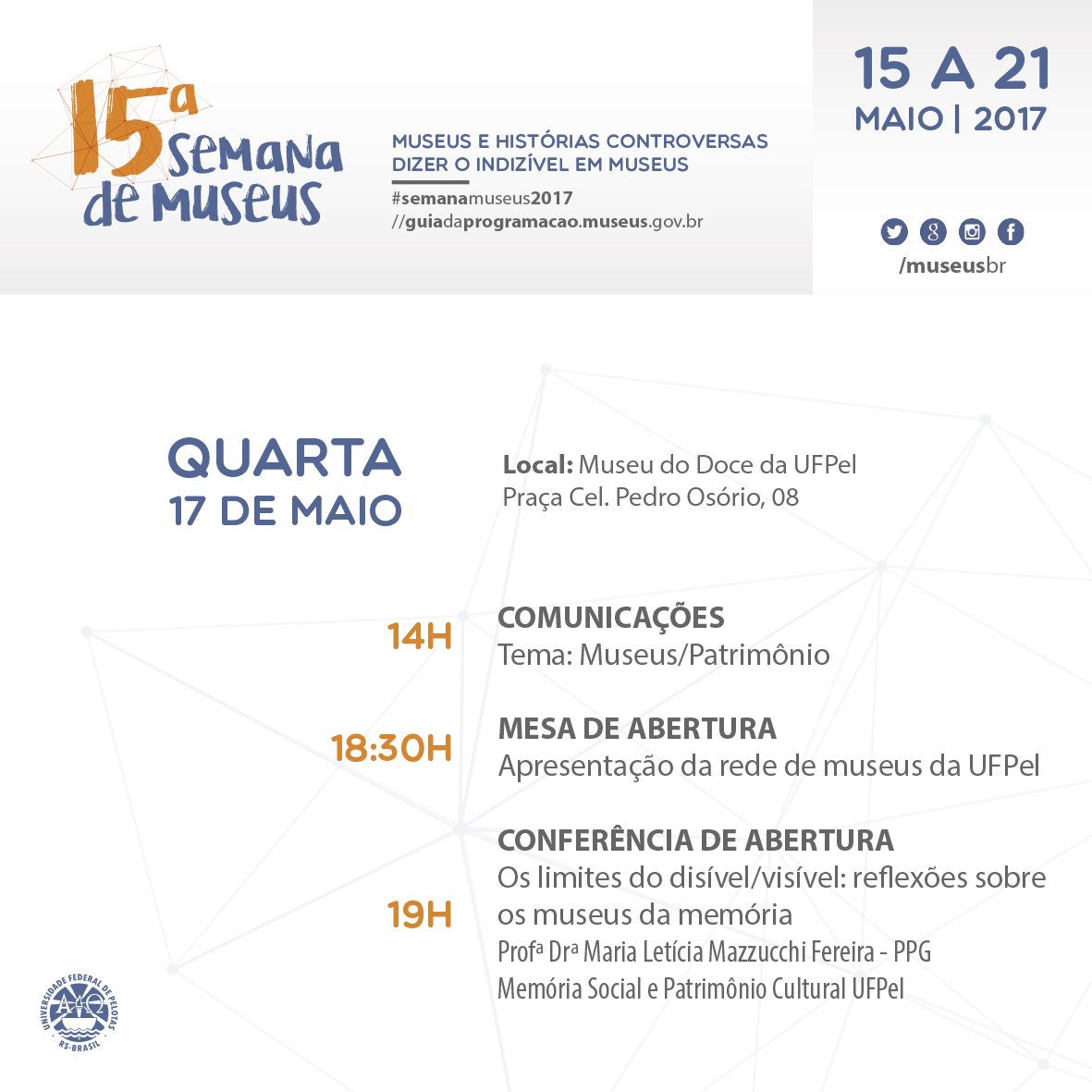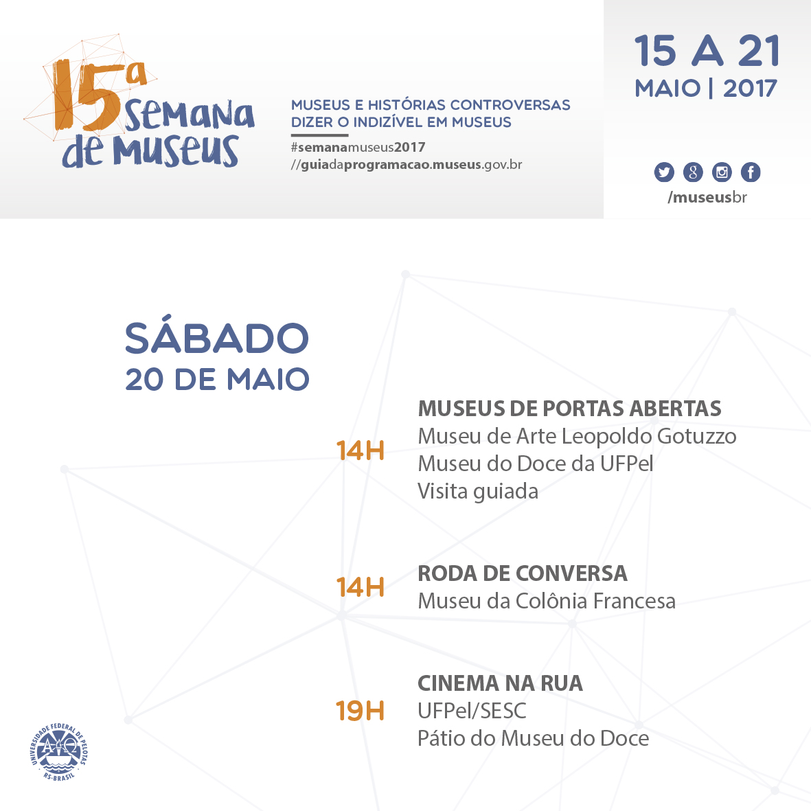 Programação completa 15ª Semana de Museus da UFPel Compartilhe essa notícia: Clique para compartilhar no Facebook(abre em nova janela) Facebook Clique para compartilhar no WhatsApp(abre em nova janela) WhatsApp Clique para compartilhar no LinkedIn(abre em nova janela) LinkedIn Clique para compartilhar no X(abre em nova janela) 18+ Clique para enviar um link por e-mail para um amigo(abre em nova janela) E-mail Clique para imprimir(abre em nova janela) Imprimir Publicado em 16/05/2017, na categoria Notícias.