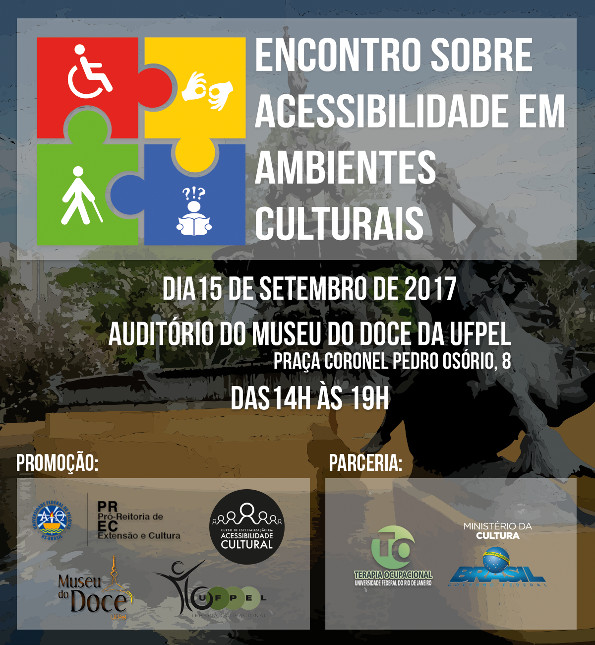A Pró-Reitoria de Extensão e Cultura e o Laboratório de Tecnologia Assistiva do curso de Terapia Ocupacional da UFPel em parceria com o Curso de Especialização em Acessibilidade Cultural da UFRJ/MinC, convidam para o Encontro sobre Acessibilidade em Ambientes Culturais que acontecerá no dia 15 de setembro no Museu do Doce.