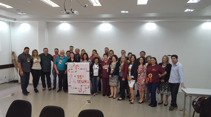 Em sua 35a edição, o SEURS reuniu 27 delegações de universidades e institutos federais. A delegação da UFPel se apresentou com 24 alunos (Ana Carolina Gluszeviz, Ana Paula Ogliari Casagrande, Carliston Lima Ribeiro, Dionatan Born Garcia, Guilherme Silveira Onofre, Janaina Bruna dos Santos Moreira, Jéssica Campos das Neves Faria, Jessica El Koury Santos, Juliana Costa Haertel, Juliana Neto Mendes de Moura, Leopoldine, Radtke Bergmann, Luana Medina, Marcos Wellington Pinto Robaina, Maria, Luiza Marins Mendes, Marina Borges Luiz, Mateus Brum de Armas, Matheus Fontoura Garcia, Natiele Isaura de Ameida Veek, Rosane Vieira da Silva , Sarah Leão Lopes, Sheldon, Dias Pilenghi, Taniely da Costa Bório, Thierry Costa Dufau, Vitória Gausmann) e com 8 professores (Douver Michelon, Josaine Rappeti, Luiz Filipe Damé Schuch, Norlai Azevedo, Noris Mara Pacheco Leal, Regiana Blank Wille, Vera Lucia Bobrowski e Francisca Michelon) que acompanharam os 17 trabalhos de extensão selecionados internamente, para preencher as 15 apresentações orais, a oficina e o minicurso nos quais as IES poderiam estar representadas.