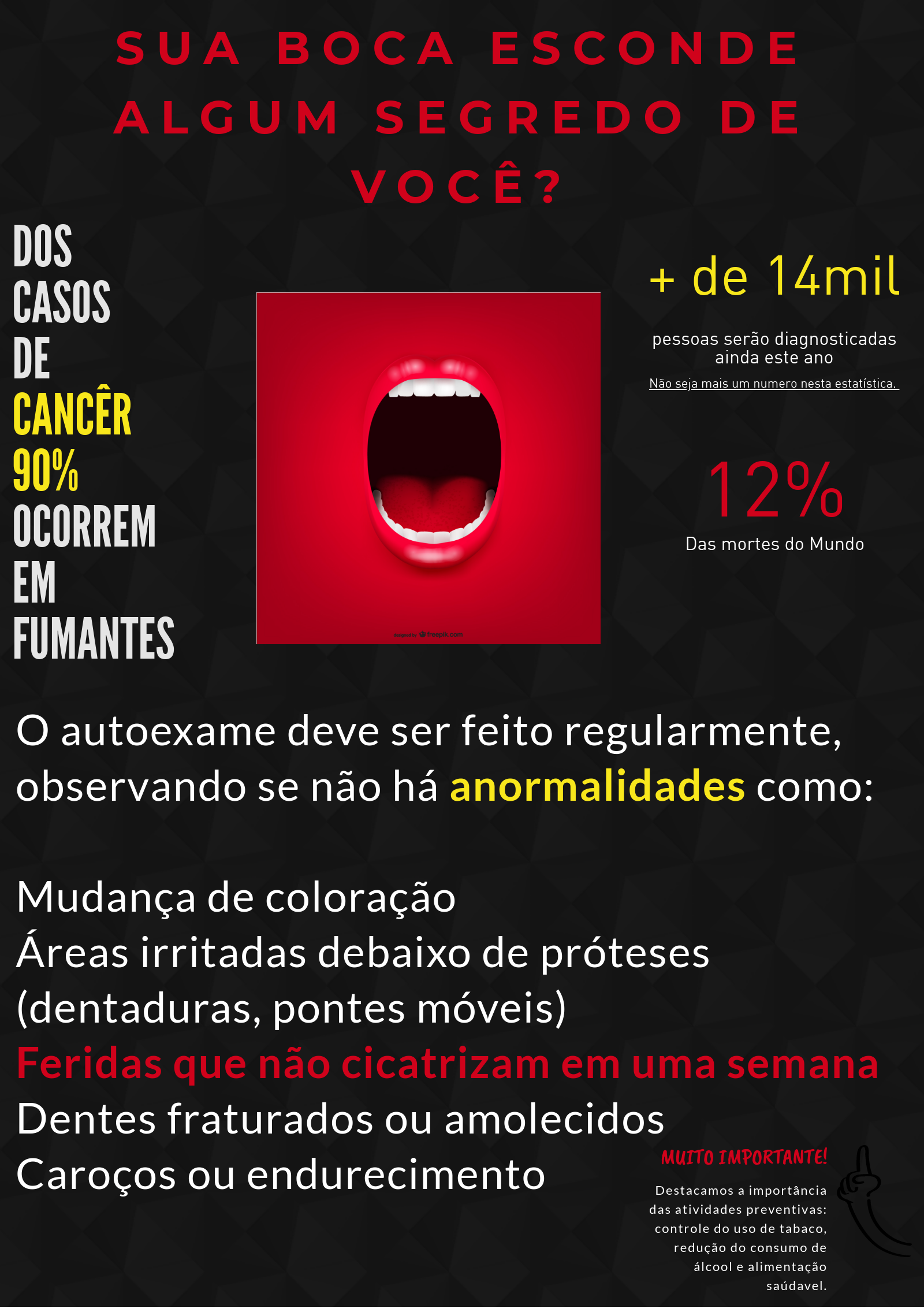 A Pró-Reitoria de Extensão e Cultura torna público o resultado da seleção dos pôsteres escolhidos para compor a exposição de “Prevenção ao Câncer Bucal”, referente ao edital 02/2018. A campanha tem o objetivo de informar e sensibilizar a população de Pelotas sobre os riscos da doença e a importância do autoexame bucal.