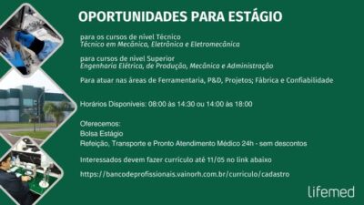 Estagiário P&D com foco em Controle de Projeto Requisito de Formação: Cursando superior em Engenharia de Produção, Administração ou afins. Necessário possuir disponibilidade de 6 horas diárias – 08:00 às 14:30 (com intervalo para refeição) Oferecemos: Bolsa Fretamento Refeitório Pronto Atendimento 24 h Interessados deverão cadastrar o currículo através do link: https://bancodeprofissionais.vainorh.com.br/curriculo/cadastro É necessário que o candidato faça o cadastro na vaga referida – ESTAGIÁRIO