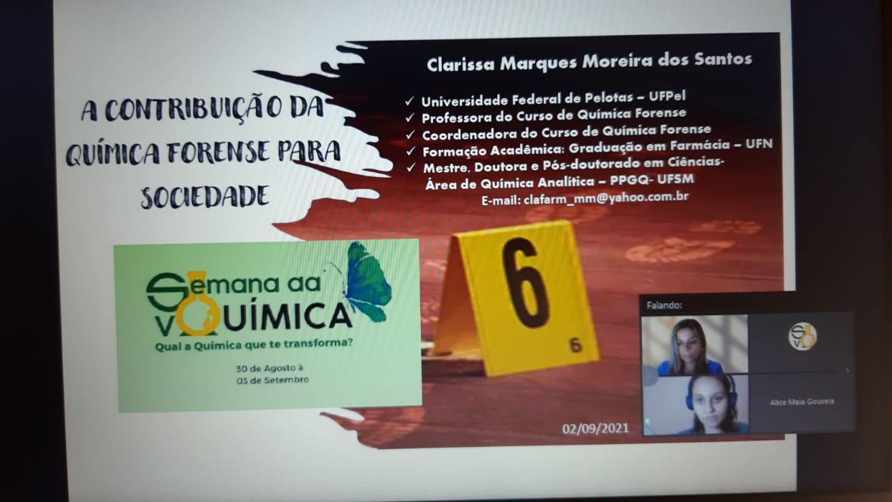 No dia 03 de setembro, a Profa Clarissa Marques Moreira dos Santos, coordenadora pro-tempore do curso de Química Forense participou como convidada pela Comissão Organizadora da V Semana Acadêmica da Química pela Universidade Federal do ABC proferindo a palestra sobre a “Contribuição da Química Forense para a sociedade”. O evento, que foi no formato online, apresentou destaque em número de inscritos e pela importância do assunto, entre as palestras da semana acadêmica.