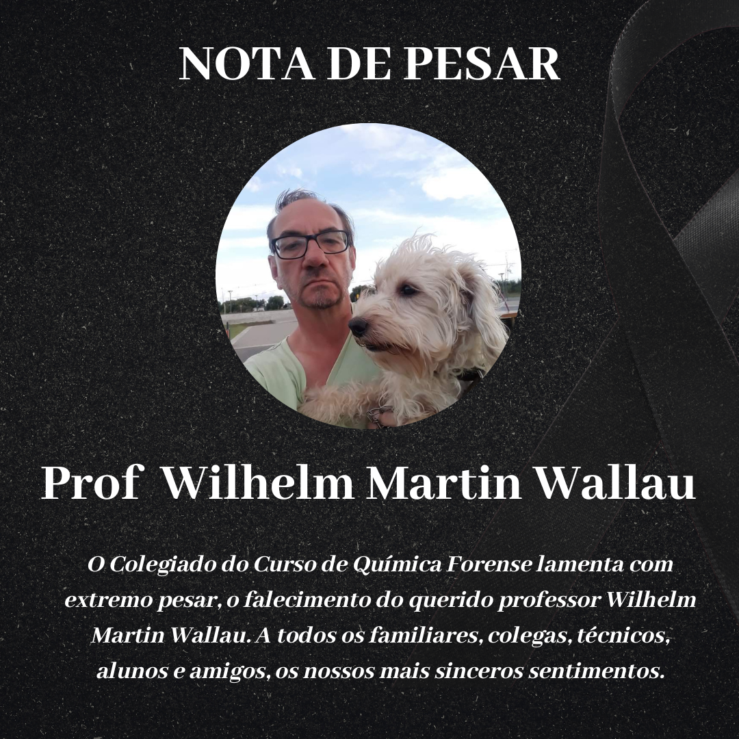 O Colegiado do Curso de Química Forense lamenta com extremo pesar, o falecimento do querido colega e membro do Colegiado do curso, professor Wilhelm Martin Wallau. O velório está acontecendo nas Capelas do Memorial Pelotas Cemitério Parque, Av Eliseu Maciel, 3003, Jardim América, na avenida do Campus Capão do Leão.