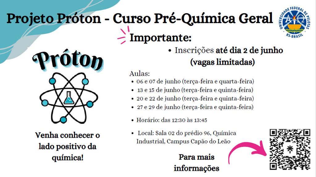 O projeto Próton, da Universidade Federal de Pelotas (UFPel), está com as inscrições abertas para o curso Pré-Química Geral. A formação é destinada a estudantes do primeiro semestre letivo de 2023 no decorrer da disciplina Química Geral, oferecida a diversas graduações da Instituição. As inscrições serão recebidas até 2 de junho, por formulário eletrônico. Para mais informações no site ou no Instagram @protonufpel do projeto.