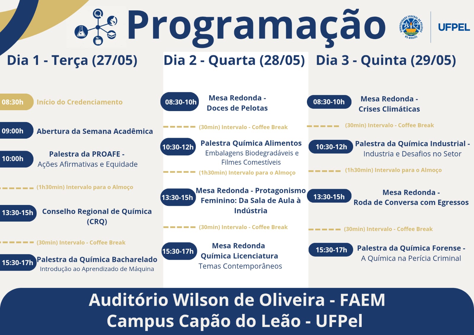 É com grande satisfação que convidamos toda a comunidade acadêmica para participar da Semana Acadêmica Integrada dos Cursos de Química e Alimentos da Universidade Federal de Pelotas (UFPel), que acontecerá entre os dias 27 e 29 de maio de 2025, no Auditório Wilson Oliveira (FAEM), localizado no Campus Capão do Leão.