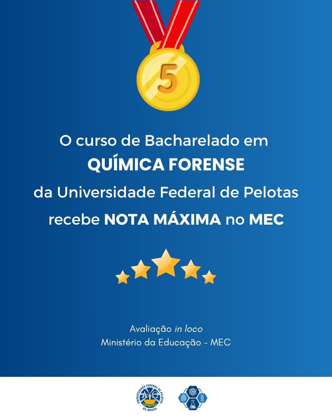 O curso de Química Forense da UFPel recebeu nota 5 ⭐, conceito máximo e sinônimo de excelência acadêmica e pedagógica, na avaliação do MEC realizada entre os dias 8 e 10 de outubro.