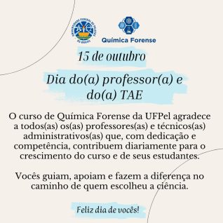Atenção, pessoal! Está aberta a seleção para representação discente junto ao colegiado do curso de Química Forense Serão escolhidos 1 titular e 1 suplente. Quem tiver interesse, envie até 10/11 as seguintes informações: Nome completo Matrícula Período atual Enviar e-mail para: quimicaforense.ufpel@gmail.com A participação vale certificado e horas em atividades complementares!