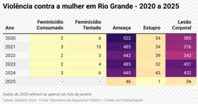 Tabela 2 – Violência contra a mulher em Rio Grande de 2020 a 2025: Maikelly Silva / Datawrapper