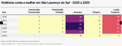 Tabela 3 – Violência contra a mulher em São Lourenço do Sul de 2020 a 2025: Maikelly Silva / Datawrapper