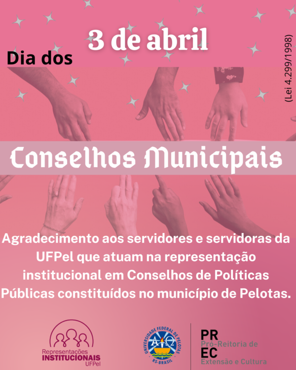 A representação da UFPel no Conselho Municipal de Saúde de Pelotas (CMSPel), pelo segmento prestadores de serviços, atualmente se dá pela atuação de Mauren Orrana Wenzke Moraes, titular, e Hadrissom Teixeira Cruz, suplente, ambos do Hospital Escola/EBSERH. O CMSPel é… Continue lendo →