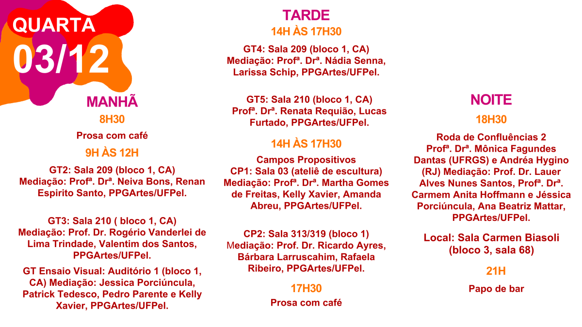 O evento engloba as três linhas de pesquisa do PPGArtes/UFPel: Educação em Artes e Processos de Formação Estética, Processos de Criação e Poéticas do Cotidiano, e Histórias e Teorias das Artes e Transversalidades. Assim, partindo das linhas de pesquisa, se abre espaço para uma diversidade de investigações que contribuem também para a construção de múltiplos saberes.