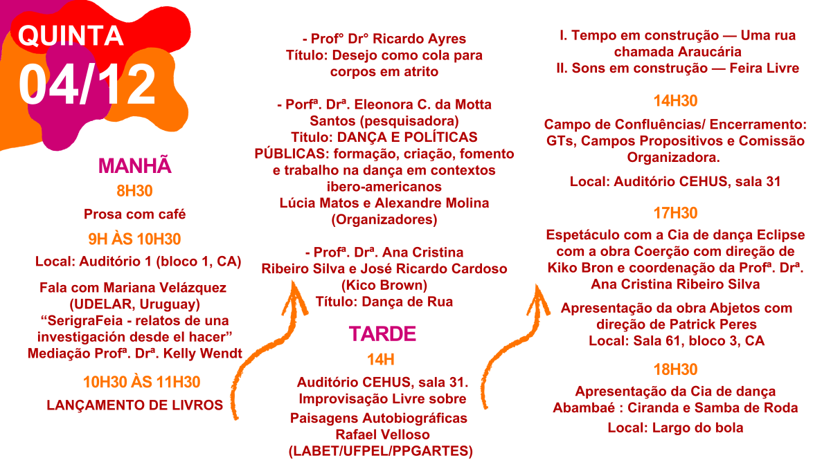 O tema CAMPO DE CONFLUÊNCIAS propõe o encontro com um lócus específico — um território de ação, vida e criação — destinado à produção de pensamento nas pesquisas em Artes. O evento parte dessa ideia de “campo” como espaços de cultivo, jogo e troca para estabelecer a comunhão entre corpo, contexto e estado de presença. Neste lugar, questões do mundo contemporâneo e da Arte, atravessando cada pesquisa, apontam formas de vinculação e de posicionamento. Por encontros que se tocam, trocam, se orientam e desorientam dentro de um campo coletivo de cultivo. Por práticas, linguagens e experiências se entrelaçam, fazendo emergir saberes e modos de pensar e fazer arte que revelam diferentes maneiras de habitar, compreender e criar mundos.