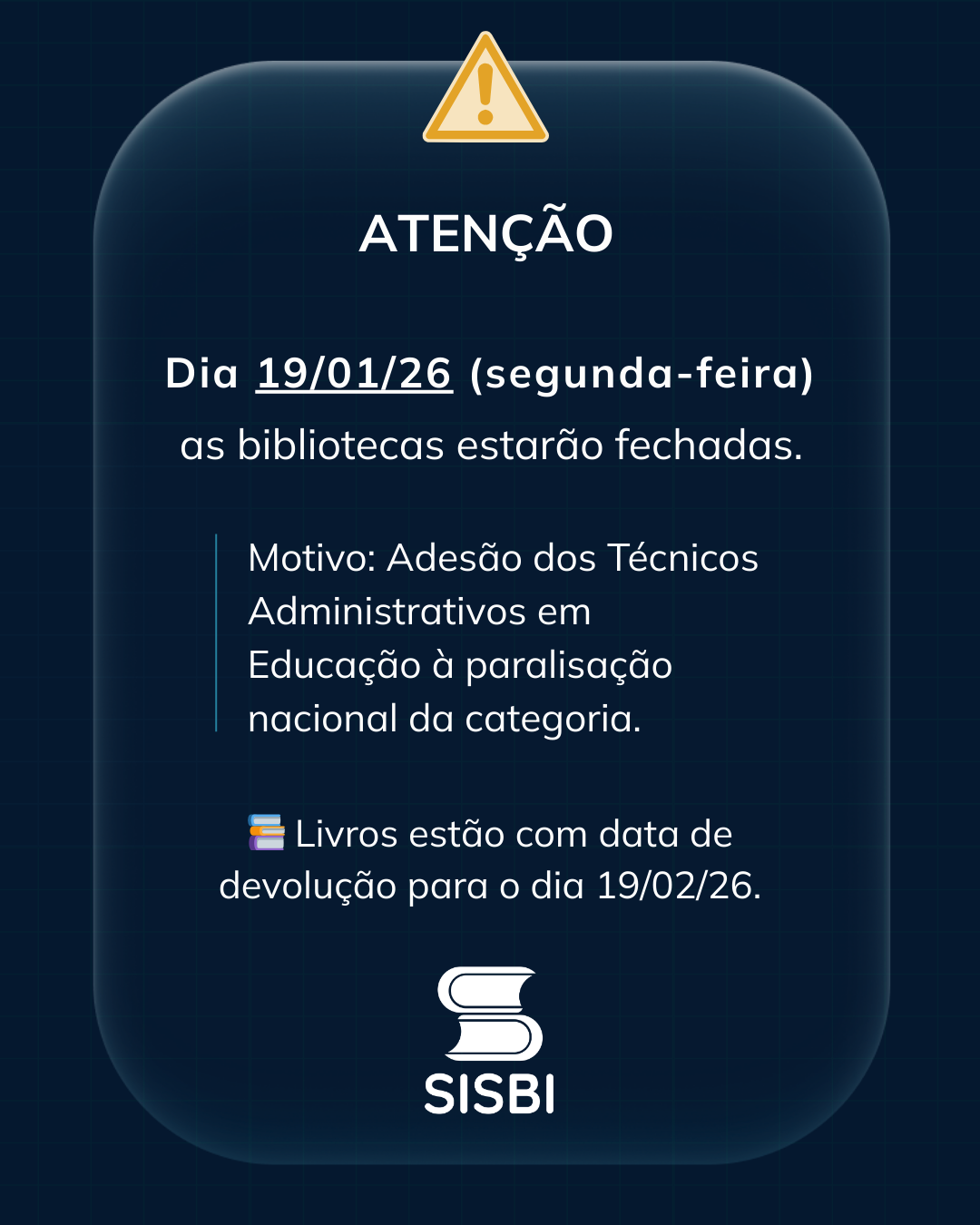 Bibliotecas estarão fechadas no dia 19/01/26 Dia 19/01/26 (segunda-feira) as bibliotecas estarão fechadas. Motivo: Adesão dos Técnicos Administrativos em Educação à paralisação nacional da categoria. 📚 Livros estão com data de devolução para o dia 19/02/26. Publicado por sisbi em 16/01/2026, na categoria Notícias.