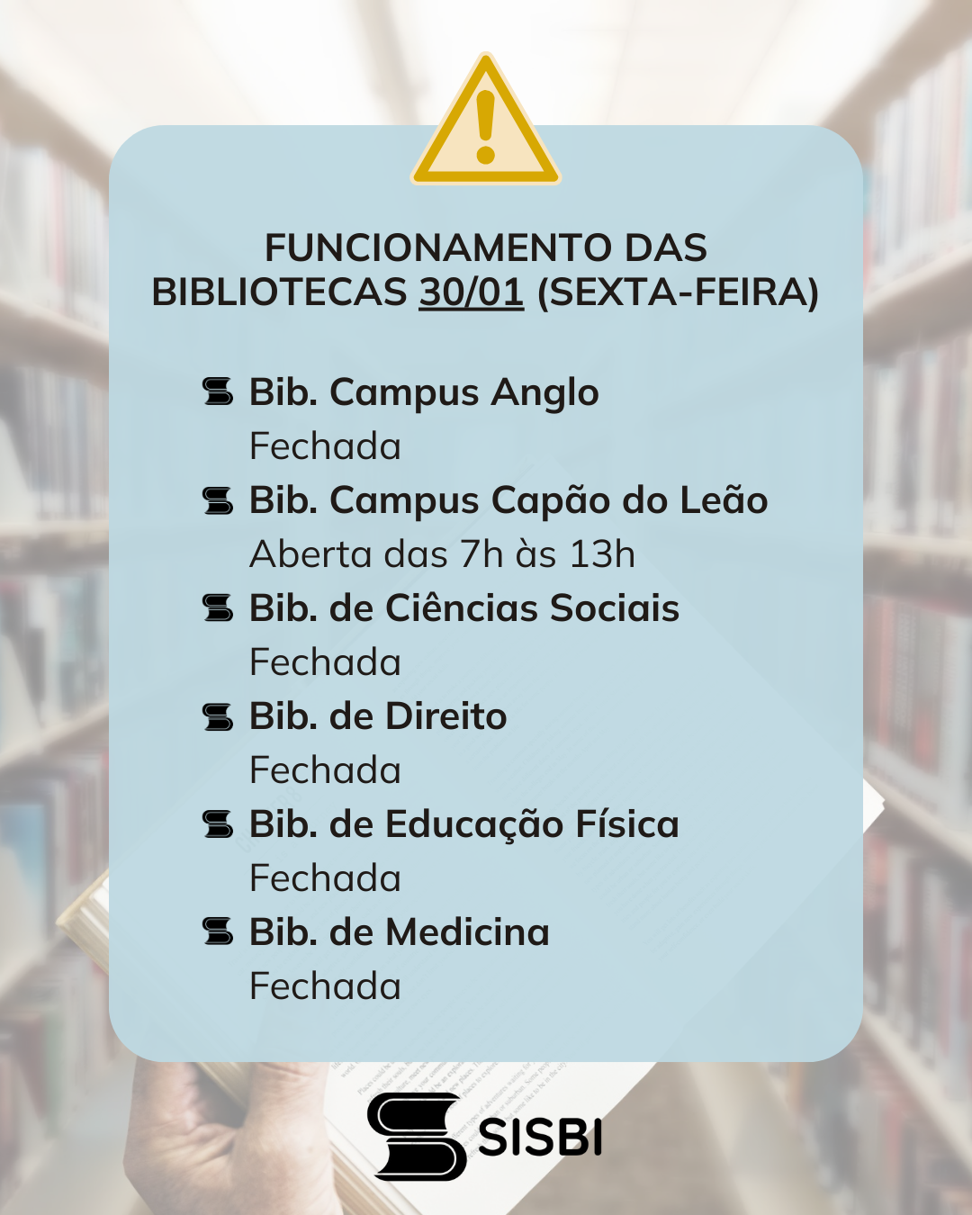 Em razão da participação de servidores técnicos-administrativos na assembleia da categoria, o funcionamento das bibliotecas será alterado, nesta sexta-feira, dia 30/01.