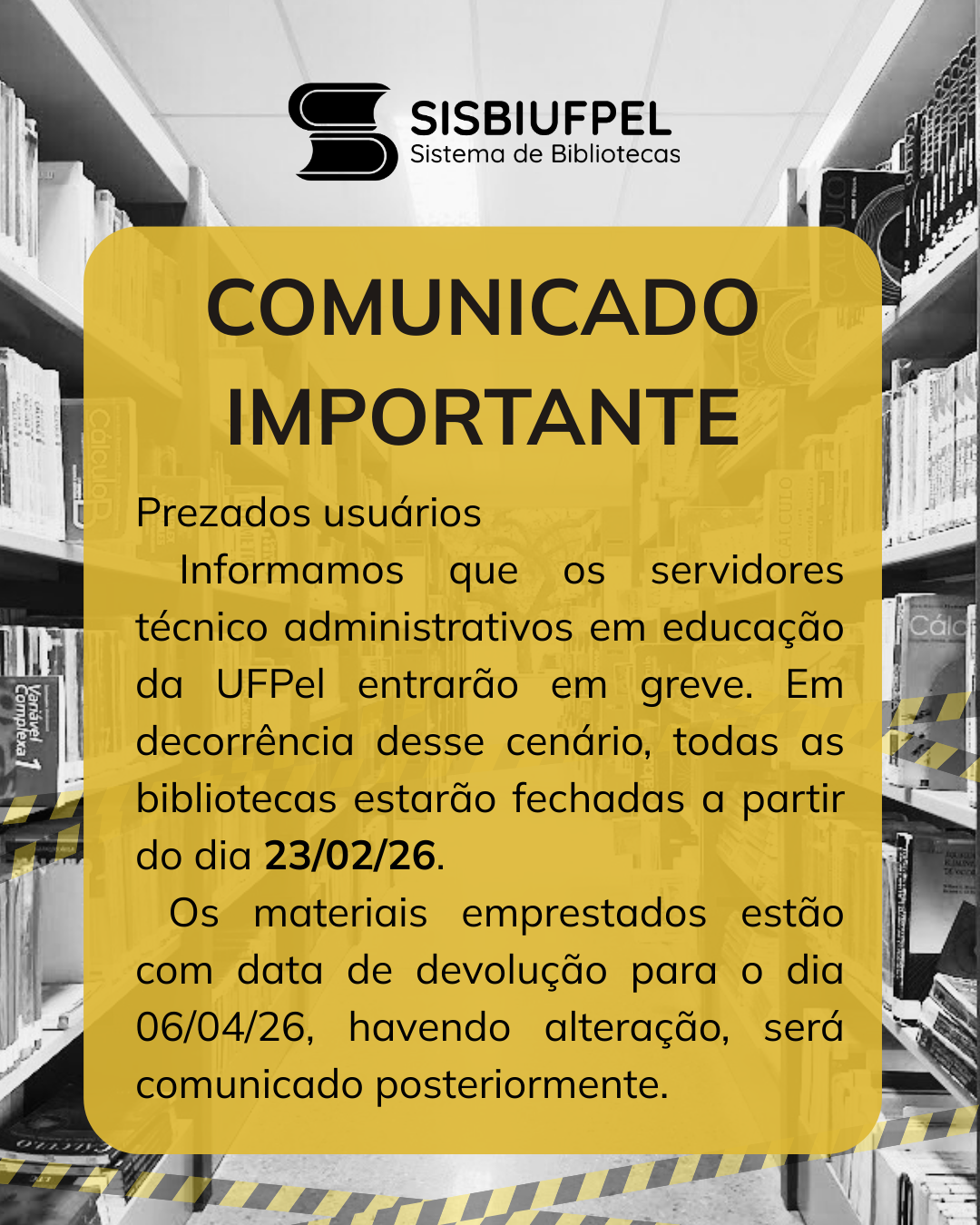 Para mais informações e atualizações sobre o funcionamento das bibliotecas durante a greve, convidamos todos a acompanharem nossas redes sociais. @sisbi.ufpel