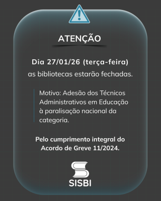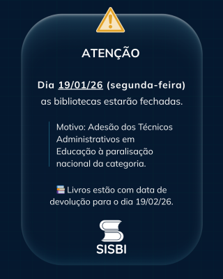 No dia 27/01/26 (terça-feira) as bibliotecas estarão fechadas, devido à adesão dos Técnicos Administrativos em Educação à paralisação nacional da categoria, pelo cumprimento integral do Acordo de Greve 11/2024.