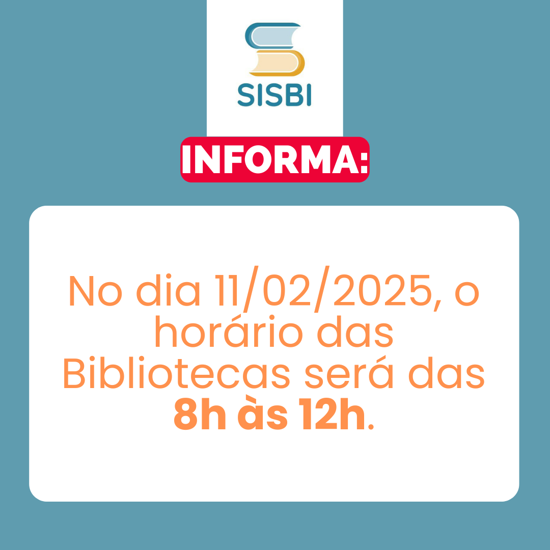 Conforme Memorando-Circular nº 2/2025/GR/REITORIA, as Bibliotecas da UFPel fecham mais cedo nos dias 10 e 11 de fevereiro de 2025. O horário de funcionamento dia 10 será das 8h às 14h, e no dia 11 o horário é das 8h às 12h.