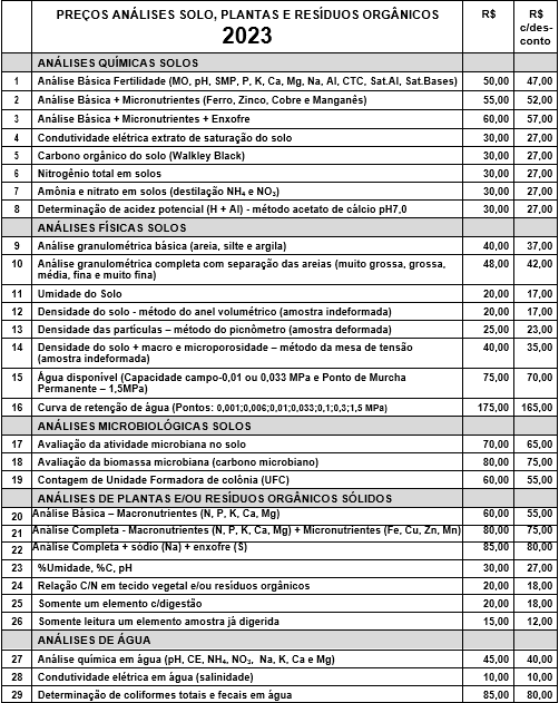 O Departamento de Solos da Universidade Federal de Pelotas informa a tabela de preços atualizados no ano 2023. Desconto cedido para lotes de 50 ou mais amostras entregue no intervalo de 30 dias e/ou para análise de projetos da Ufpel.