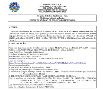 O Departamento de Solos da Universidade Federal de Pelotas seleciona bolsista de monitoria para as seguintes disciplinas: Morfologia e Gênese do Solo e Classificação e Levantamento do Solo. O período de inscrição vai do dia 23/08 até 26/08.