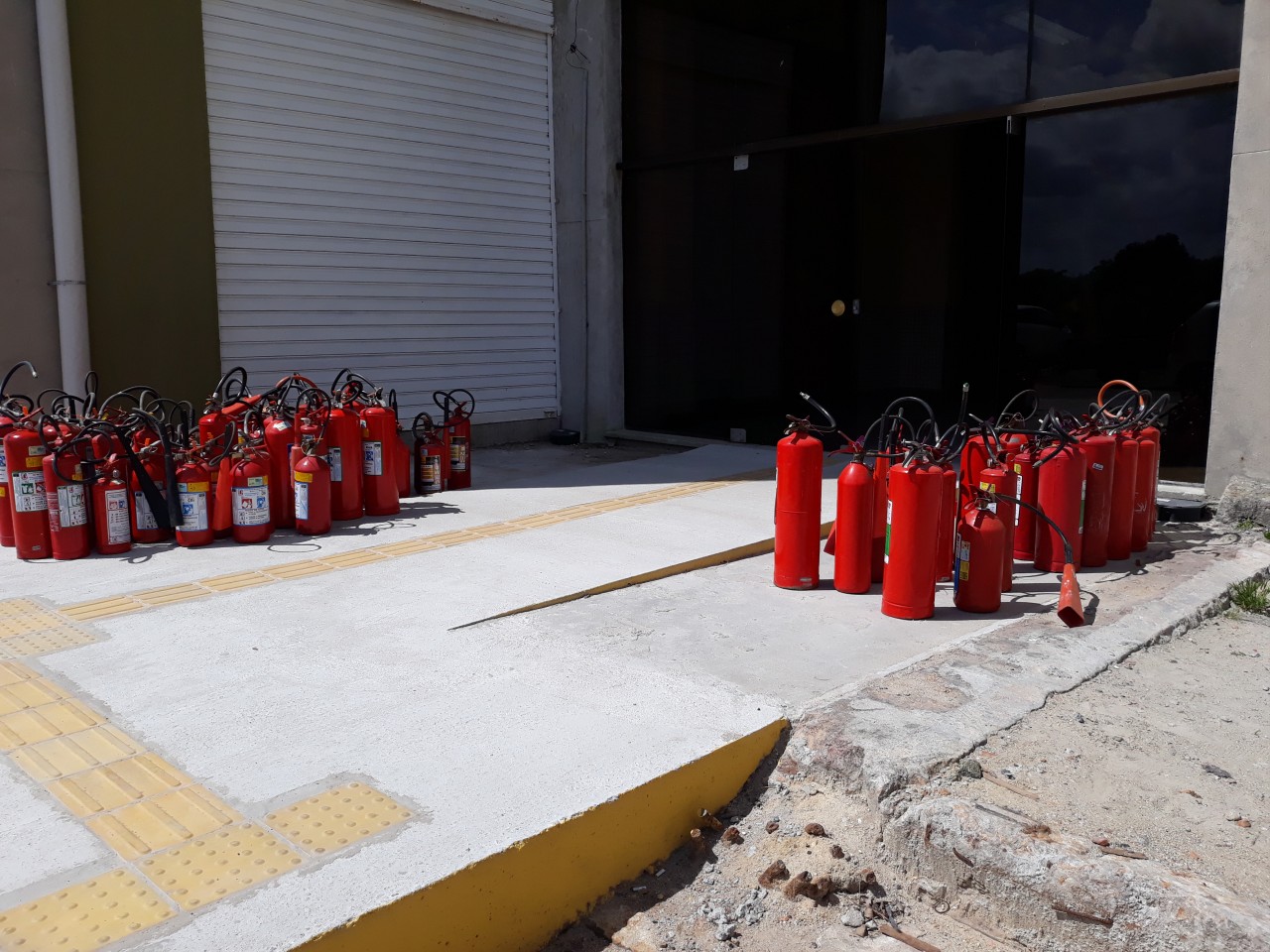 Servidores da Superintendência de Infraestrutura acompanham empresa terceirizada na substituição de extintores realizada nas dependências do complexo ANGLO / Campi Pelotas.