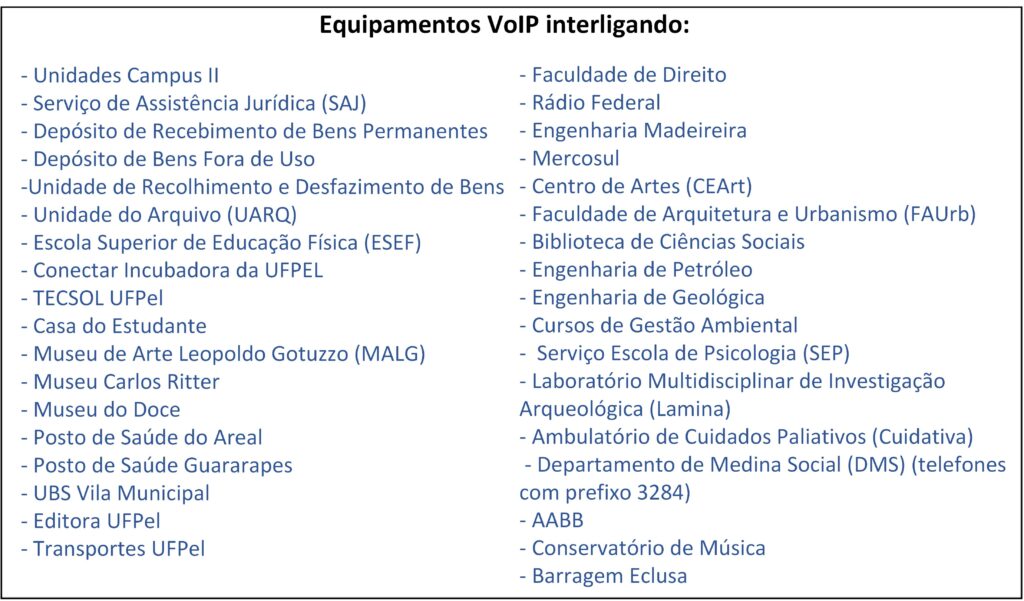 Esta ação é mais um passo da Unidade de Telefonia para aprimorar a comunicação entre as diversas unidades da UFPel, ao mesmo tempo em que promove a diminuição dos custos. Alinhada às ações de implementação de novas centrais telefônicas, instalação de dispositivos VoIP (substituindo telefones convencionais), fidelização de operadoras (as unidades não precisam digitar a operadora para ligações interurbanas), concretização de novos contratos e implantação de interfaces celulares para encaminhamento de chamadas para telefones móveis, esta iniciativa evidencia o comprometimento e a atenção da UTEL na redução das despesas relacionadas a ligações telefônicas.
