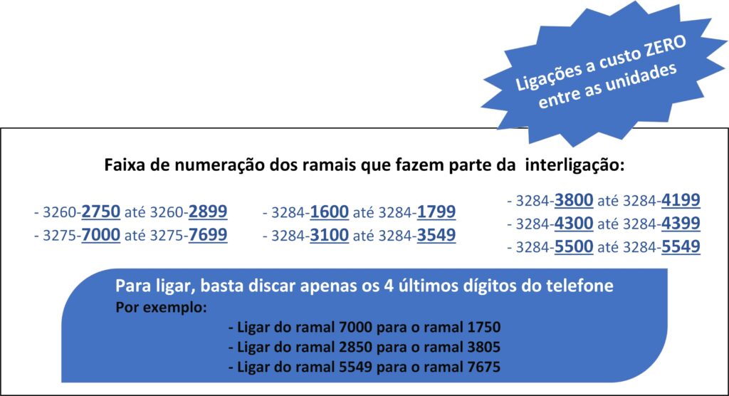 Lembrando, para efetuar uma ligação, você deve digitar os quatro últimos dígitos dos telefones situados nestas localidades. Para auxiliar na identificação, a seguir estão as faixas de numeração nas quais os telefones estão habilitados para realizar ligações entre si sem custos adicionais: