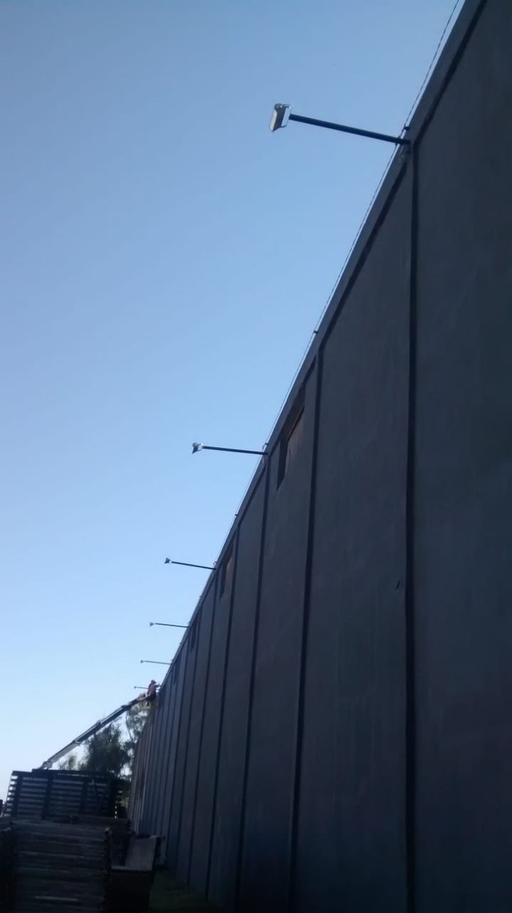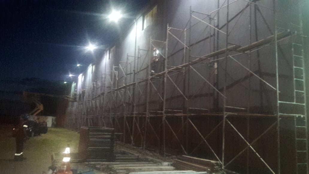 A fachada lateral do Núcleo de Transportes da UFPel recebeu pintura e instalação de refletores para a realização de atividade cultural de grafitagem.